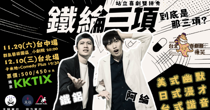 2025/11/29(Sat)View EventEntertainment 【11/29台中】《鐵綸三項》站立喜劇雙拼秀