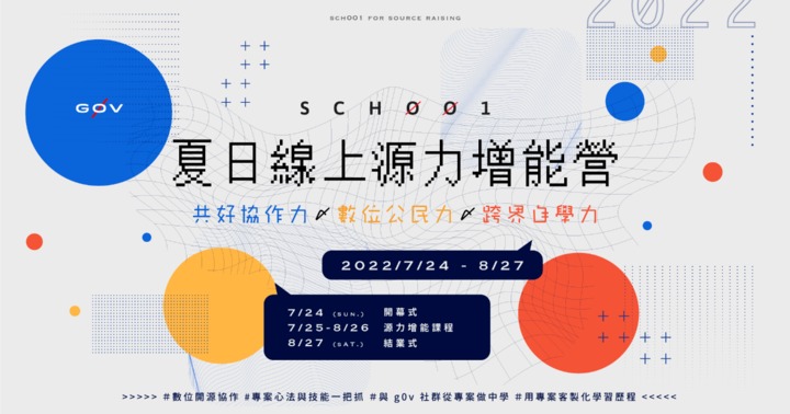 g0v 如何協作出 818+ 件各領域的專案?來零時小學校 2022 夏日源力增能營找答案吧! 7/24-8/27 你將經歷 22 堂數位公民課程、專題實作,培養數位公民力、共好行動力、跨界自學力!