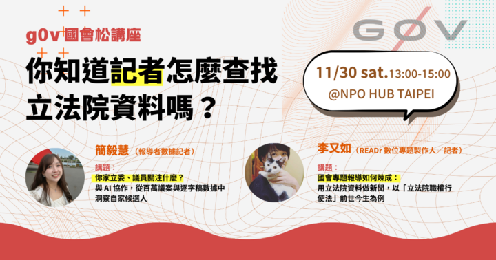 本次國會松將不採協作 hacking ,我們邀請到《報導者》數據記者簡毅慧、《READr》數位專題製作人李又如,將與你分享報導背後的數據調查過程,並帶大家實作查詢立院資料!
