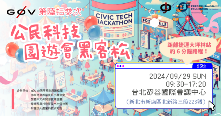 g0v 第陸拾參次公民科技園遊會黑客松將在 2024.09.29(日)於新店台北矽谷會議中心舉辦,歡迎公民、鄉民、憤青等諸眾,帶著熱血來盡一己之力,開源協作參與社會。