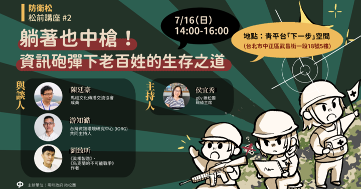 g0v 揪松團將在 7/16(日)舉辦松前講座,我們邀請到了陳廷豪及游知澔分享馬祖斷網及資訊戰經驗,並由《真相製造》作者劉致昕擔任主持人,一起探討資訊砲彈下老百姓的生存之道!